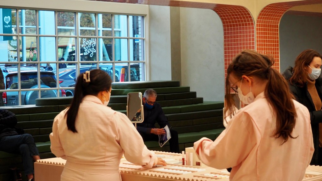Glossier employees in pink jumpsuits are organizing and sanitizing the counters that display the products in Glossier’s location at Capitol Hill, Seattle, Wash., on Sunday, Nov. 21, 2021. The brand opened its first permanent location in addition to the New York City headquarters in Capitol Hill, Seattle in August. (Photo: Daphne Xia)