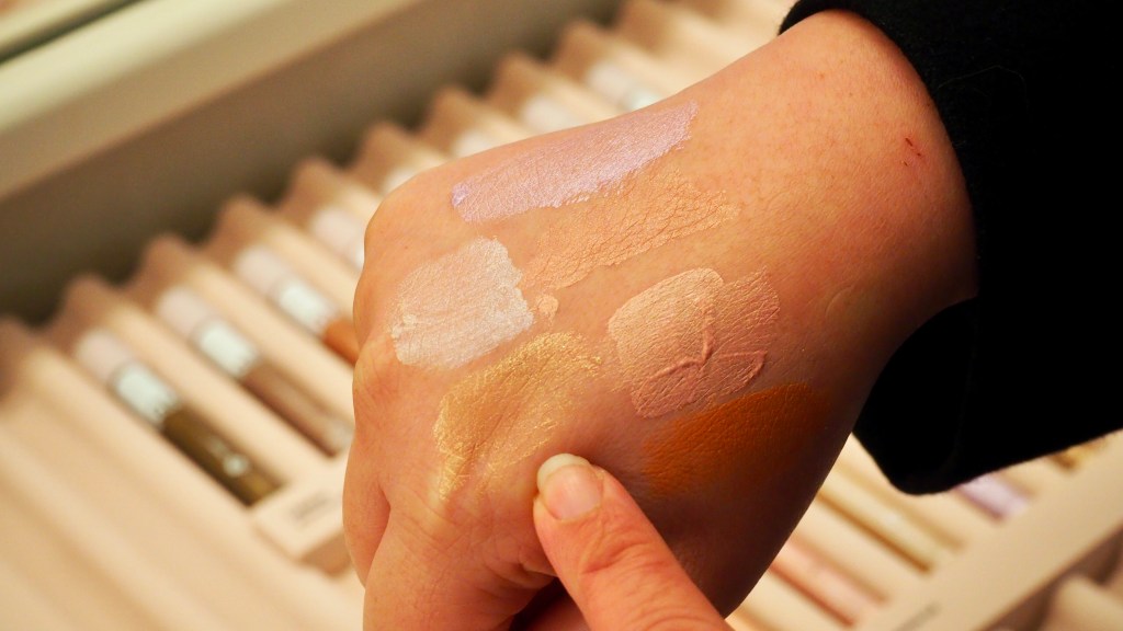A customer shows the eyeshadow swatches she did on her hand in Glossier’s location at Capitol Hill, Seattle, Wash., on Sunday, Nov. 21, 2021. Glossier offers both products that have vibrant colors and products that don’t conceal or alter facial features. (Photo: Daphne Xia)