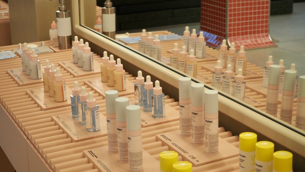 Glossier’s skincare and makeup products are being displayed in its location at Capitol Hill, Seattle, Wash., on Sunday, Nov. 21, 2021. Customers purchase and receive their products by waiting by a window and pick up their order when their names are called.(Photo: Daphne Xia)